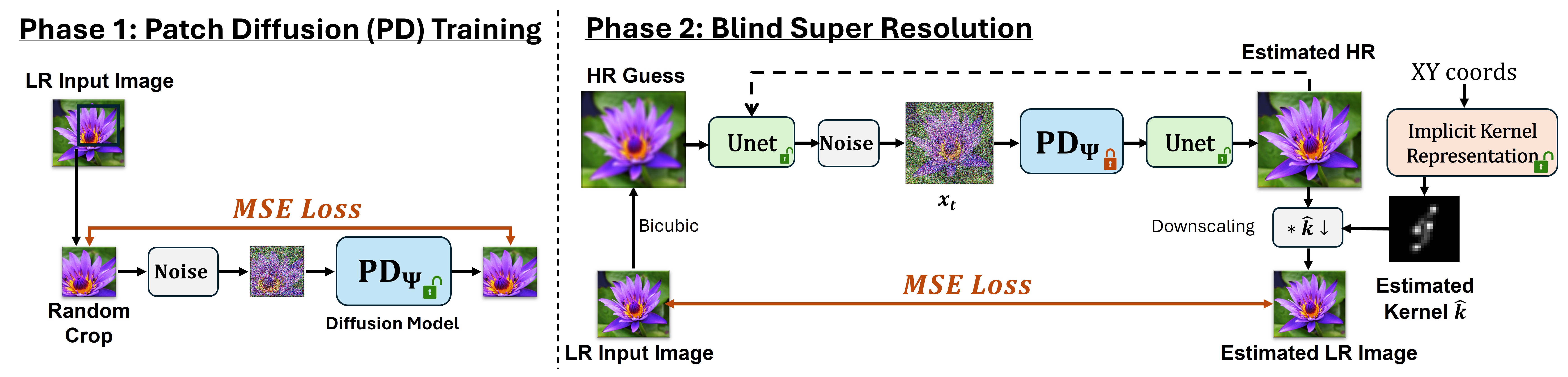 Phase 2: We perform blind SR and kernel estimation simultaneously. In particular, we use the trained PD to shift the HR guess toward the patch distribution of the LR input. A refinement U-Net and an implicit kernel representation model are trained jointly under a consistency loss, ensuring that convolving the estimated HR image with the learned kernel reproduces the original LR image.