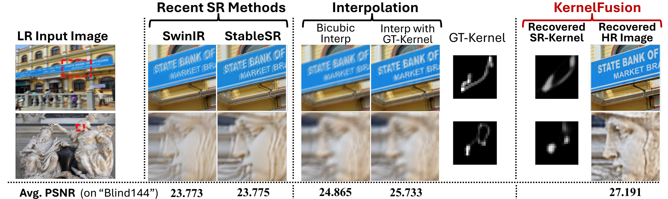 We further evaluate KernelFusion on real-world images from various sources, where the true downscaling kernel is unknown. Notably, the recovered kernels are non-Gaussian, highlighting that real-world degradations deviate from the simplistic assumptions made by existing Blind-SR methods. Our method produces sharp reconstructions without any assumption on the degradation.