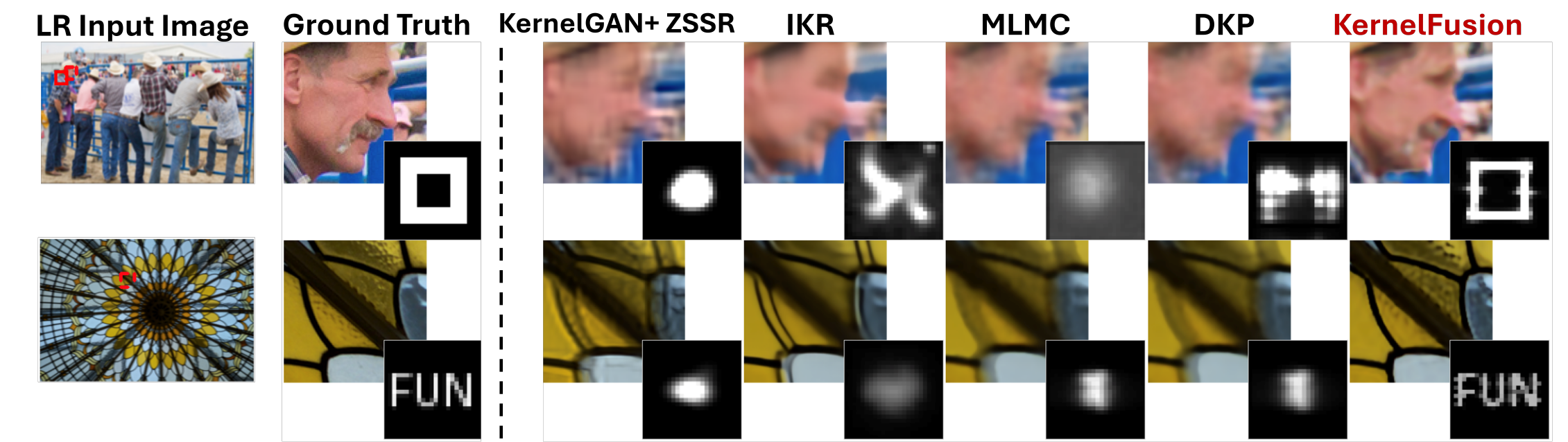 We introduce KernelFusion, a zero-shot diffusion-based approach that learns an image-specific patch prior from the input LR image and jointly estimates an unrestricted SR kernel and the HR reconstruction by maximizing cross-scale patch consistency.